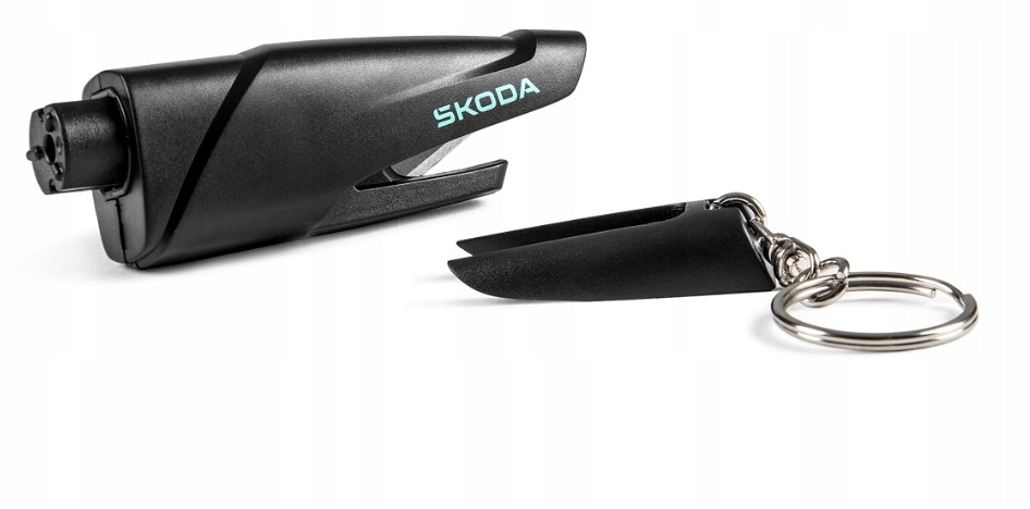 Kompaktowe, wydajne narzędzie ewakuacyjne jako praktyczny brelok. Nadrukowane logo Škoda w kolorze elektrycznym. Breloczek spełnia dwie funkcje: przecinaka osłoniętego wysuwanym klipsem do przecinania zakleszczonych pasów bezpieczeństwa oraz igły do wybijania szyb bocznych samochodu. Igła udarowa uruchamiana jest poprzez dociśnięcie głowicy sprężyny do szyby samochodu. Naciśnij, aż kliknie. Nowo w opakowaniu z recyklingu, bez plastiku.