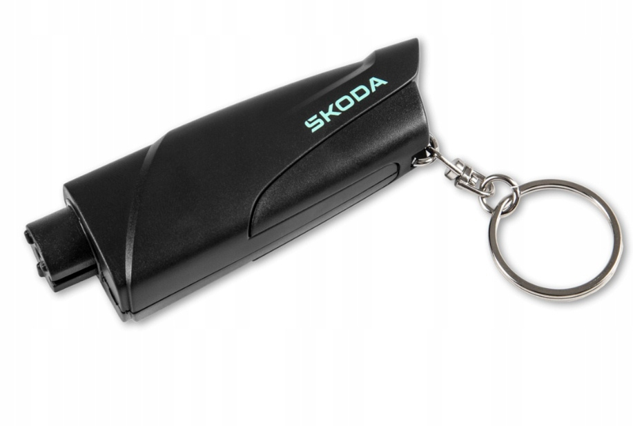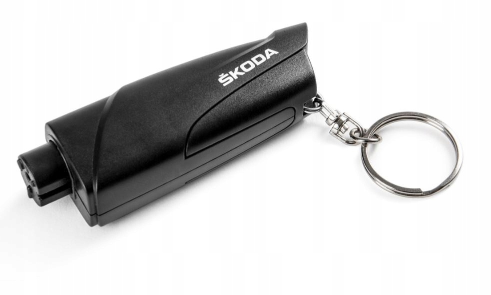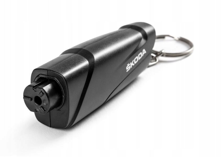 Kompaktowe, wydajne narzędzie ewakuacyjne jako praktyczny brelok. Nadrukowane logo Škoda w kolorze elektrycznym. Breloczek spełnia dwie funkcje: przecinaka osłoniętego wysuwanym klipsem do przecinania zakleszczonych pasów bezpieczeństwa oraz igły do wybijania szyb bocznych samochodu. Igła udarowa uruchamiana jest poprzez dociśnięcie głowicy sprężyny do szyby samochodu. Naciśnij, aż kliknie. Nowo w opakowaniu z recyklingu, bez plastiku.